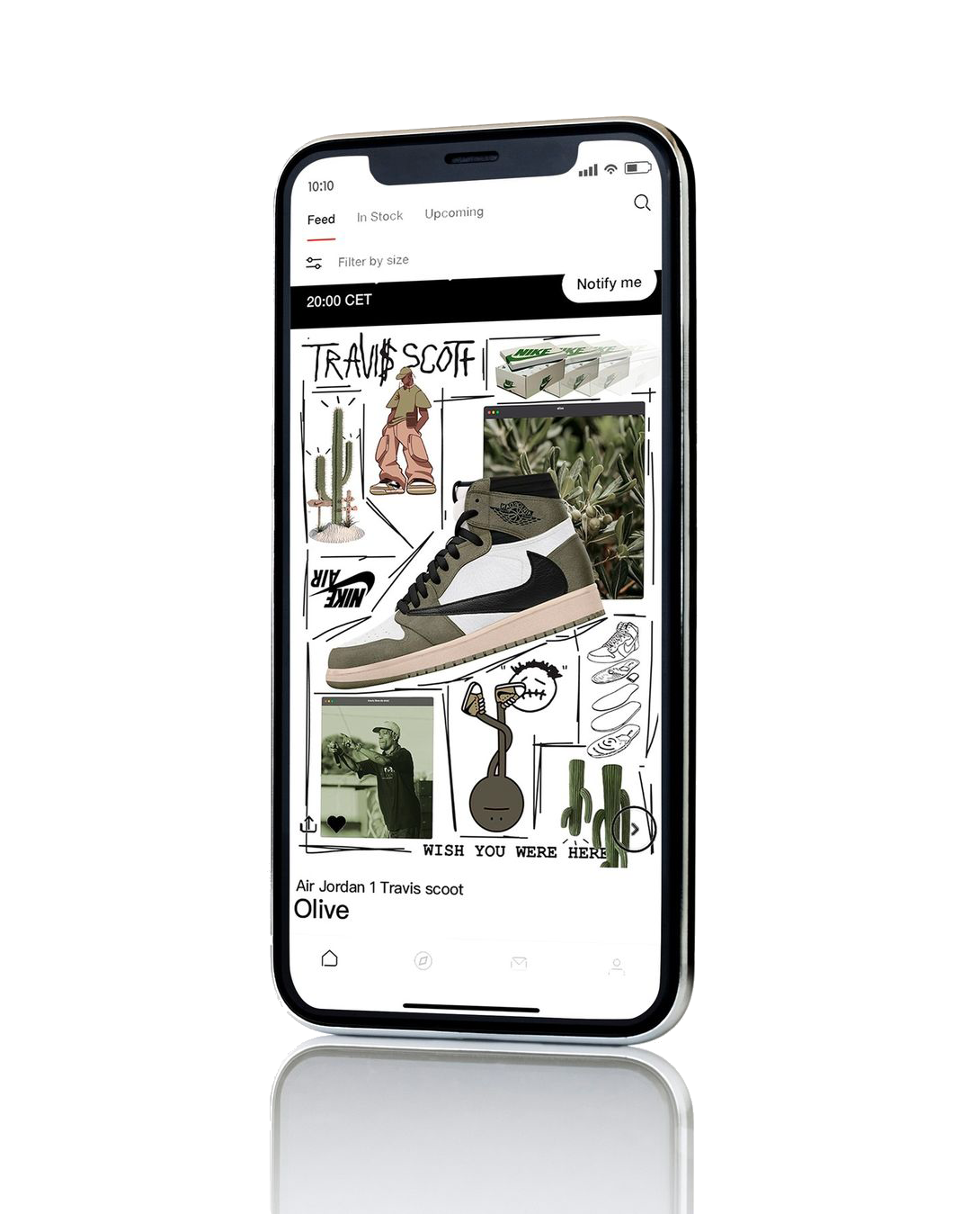 Affiche publicitaire fictive Nike x Travis Scott inspirée des méthodes de ManvsMachine. Dominante olive, structures géométriques précises et traits manuscrits originaux
